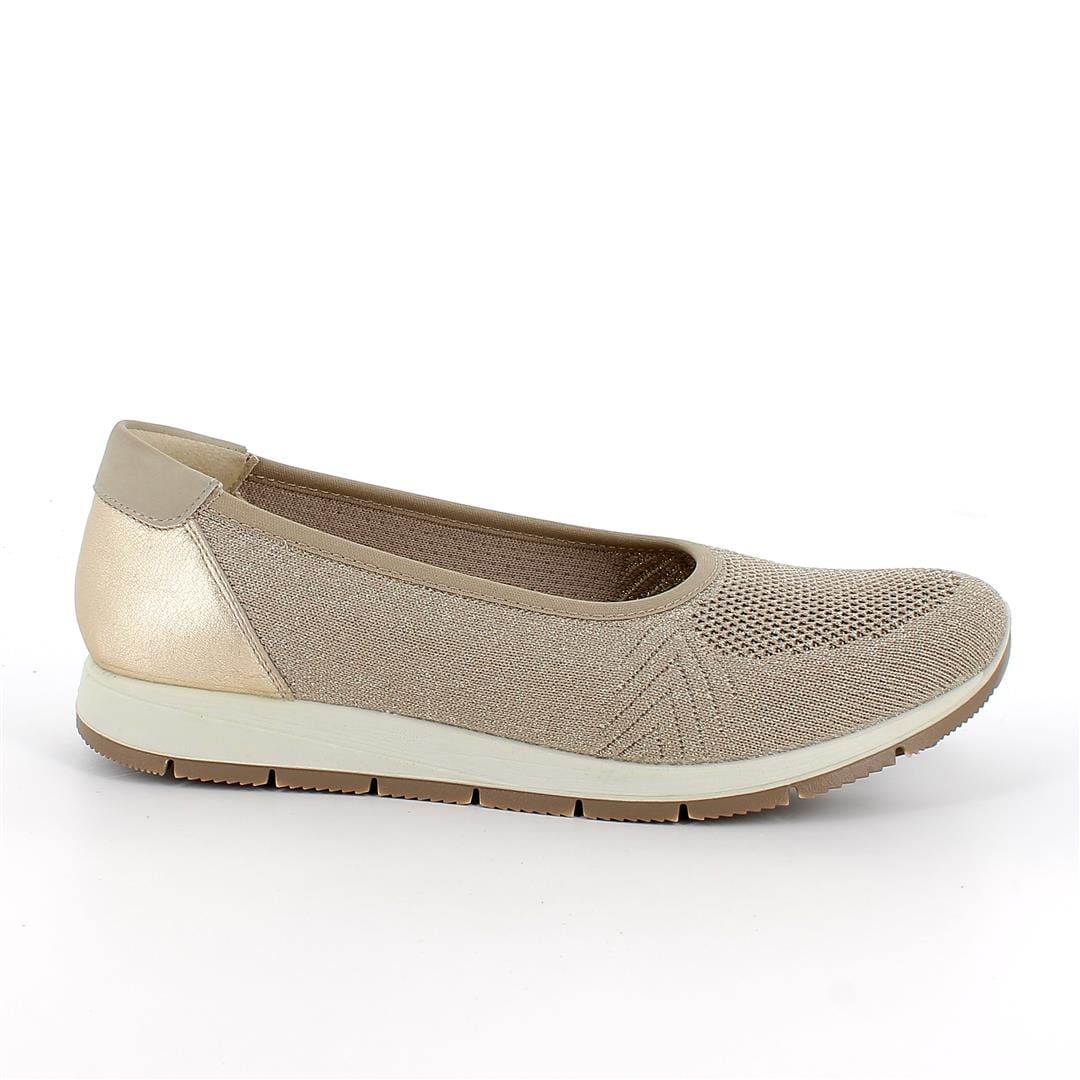 Ženska usnjena in tekstilna balerinka IMAC. Zgornji material mehko goveje usnje in kvaliteten recikliran tekstil, podloga zračen tekstil, snemljiv vložek iz naravnega govejega usnja, mehak nedrseč gumi podplat.