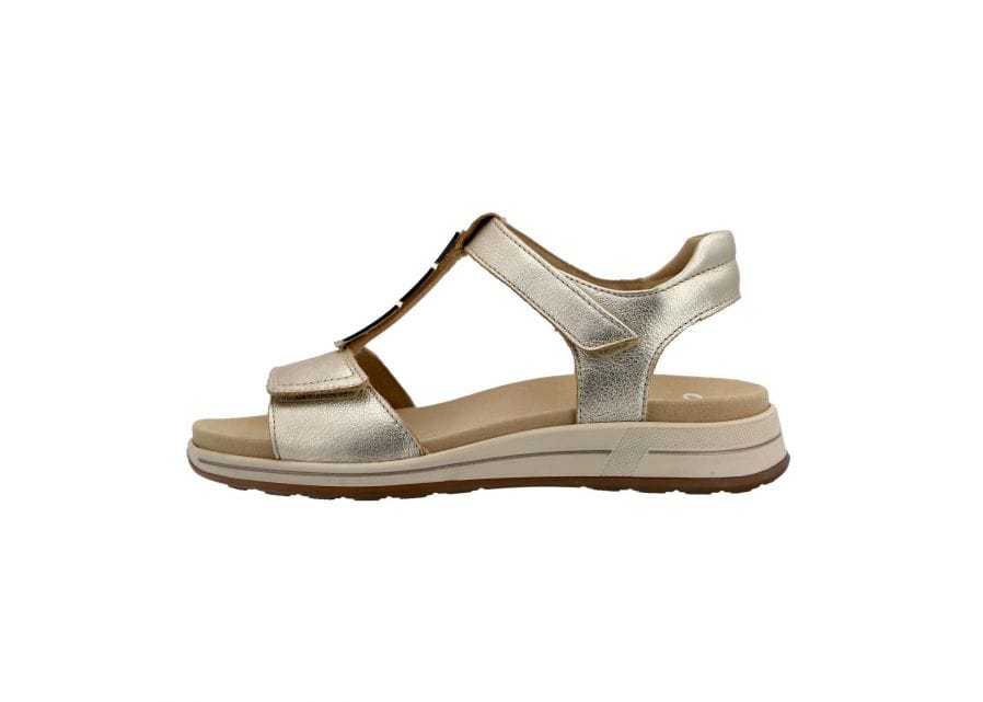 Ženski sandal Ara. Zgornji material mehko naravno goveje svetleče usnje, podloga svetlo naravno goveje usnje, Odstranljiv anatomski vložek iz mehkega naravnega govejega semiš nedrsečega usnja z dodatno (HIGH SOFT) nogi prilagodljivo tehnologijo, podplat prava surova nedrseča guma.