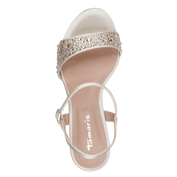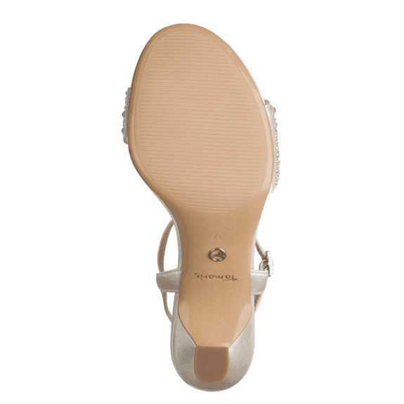 Ženski sandal Tamaris. Zgornji material vegansko usnje z biseri, podloga mehko vegansko usnje, memory vložek iz mehkega veganskega usnja, plesni podplat iz surove mase.